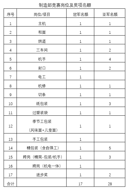 技能大赛不仅为员工提供一个展示自我的舞台,其评定结果更是生产体系各岗位年度调薪的重要依据,直接与员工个人的薪资、绩效考核等挂钩。此外,技能大赛评定出的各岗位技能标兵还将获得丰厚大奖。具体评比岗位及获奖名额分配如下: