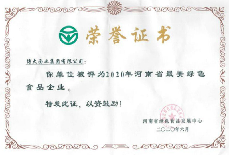 “春风万里,绿色有你--绿色生产、绿色消费、绿色发展”为此次绿色食品宣传活动的主题。活动现场,河南省绿色食品发展中心余新华主任宣读博大面业被评为“河南省最美绿色食品企业”,并为我们颁发了荣誉证书和奖牌。