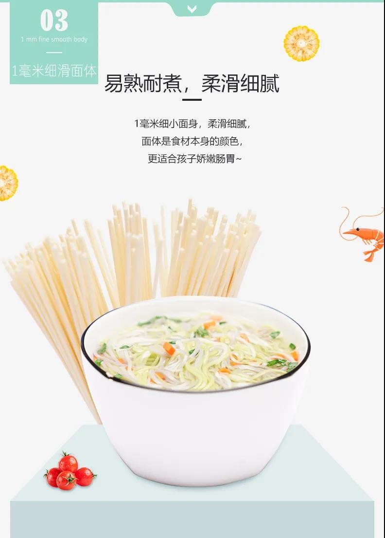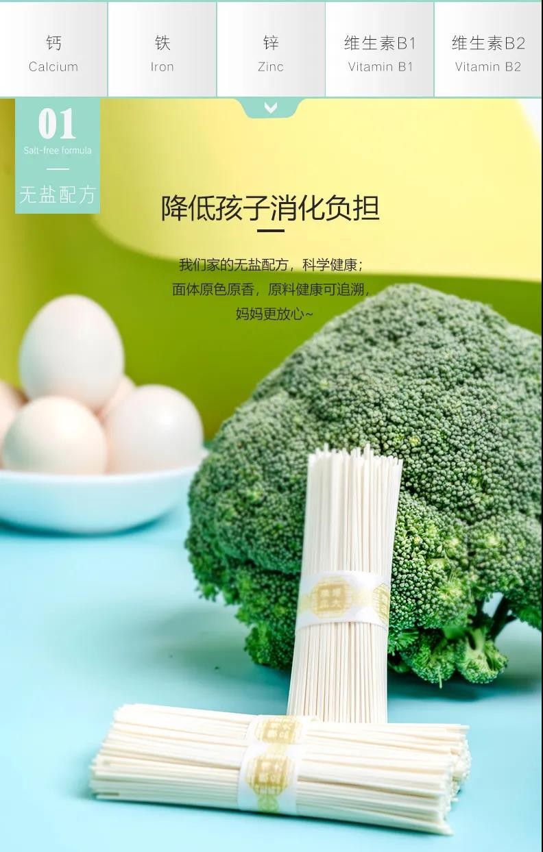 给宝贝无盐的爱。科学调配5种营养素,提取麦芯精华,1毫米的细小面体,柔滑细腻,降低孩子的消化负担,面体原色原香,原料健康可追溯,妈妈更放心~