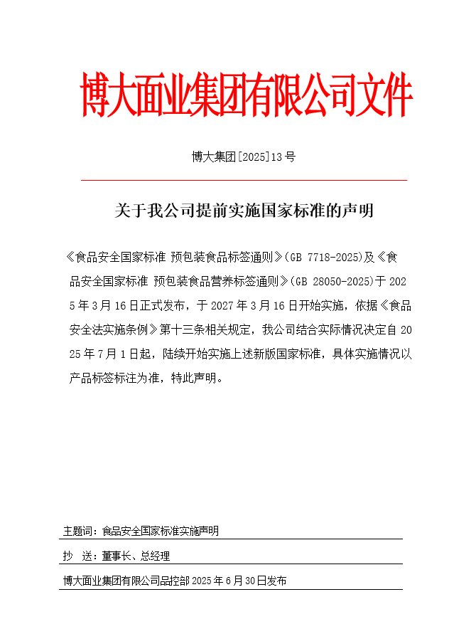 关于我公司提前实施国家标准的声明