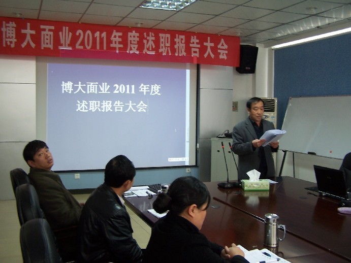 经过精心策划准备,郑州博大面业有限公司2011年度述职报告会于12月16日在公司会议室准时召开。董事长王新合向大会致辞,阐明了此次大会旨在总结各位管理干部2011年度履职业绩和2012年思路规划的重要意义。本次述职报告会议历时八个小时,公司中层以上管理干部逐一述职并接受评委团评议。