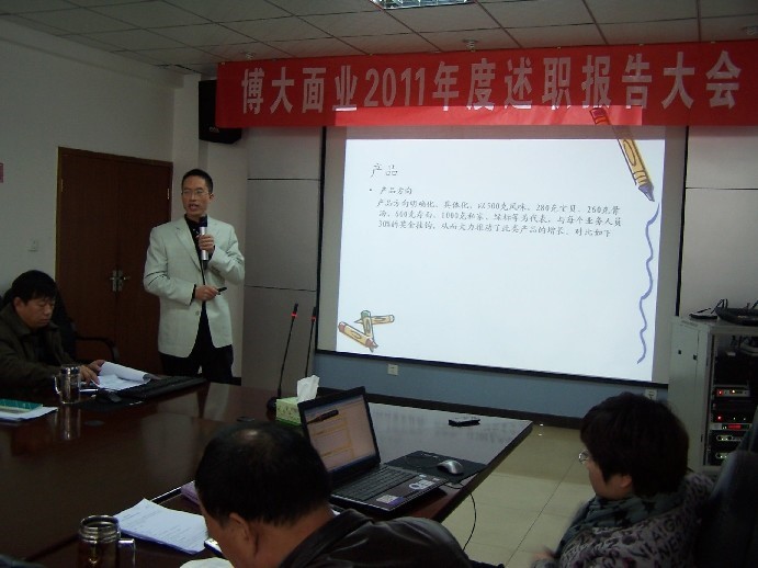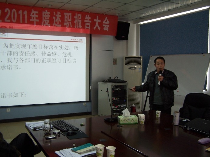 最后董事长对此次报告会做了总结和指示指出本次述职报告会是一个成功的大会,在每个人的报告中都看到了个人的业绩,也看到了一些不足之处。在2012年中我们要始终围绕“一切为了扩大市场份额、一切为了增加产量、一切为了提高员工收入、一切为了企业效益”的四个一切为指导方针,针对每个部门履职者所出现不足之处,希望各位更加努力的学习提高。2011年度郑州博大面业有限公司述职报告大会圆满成功!